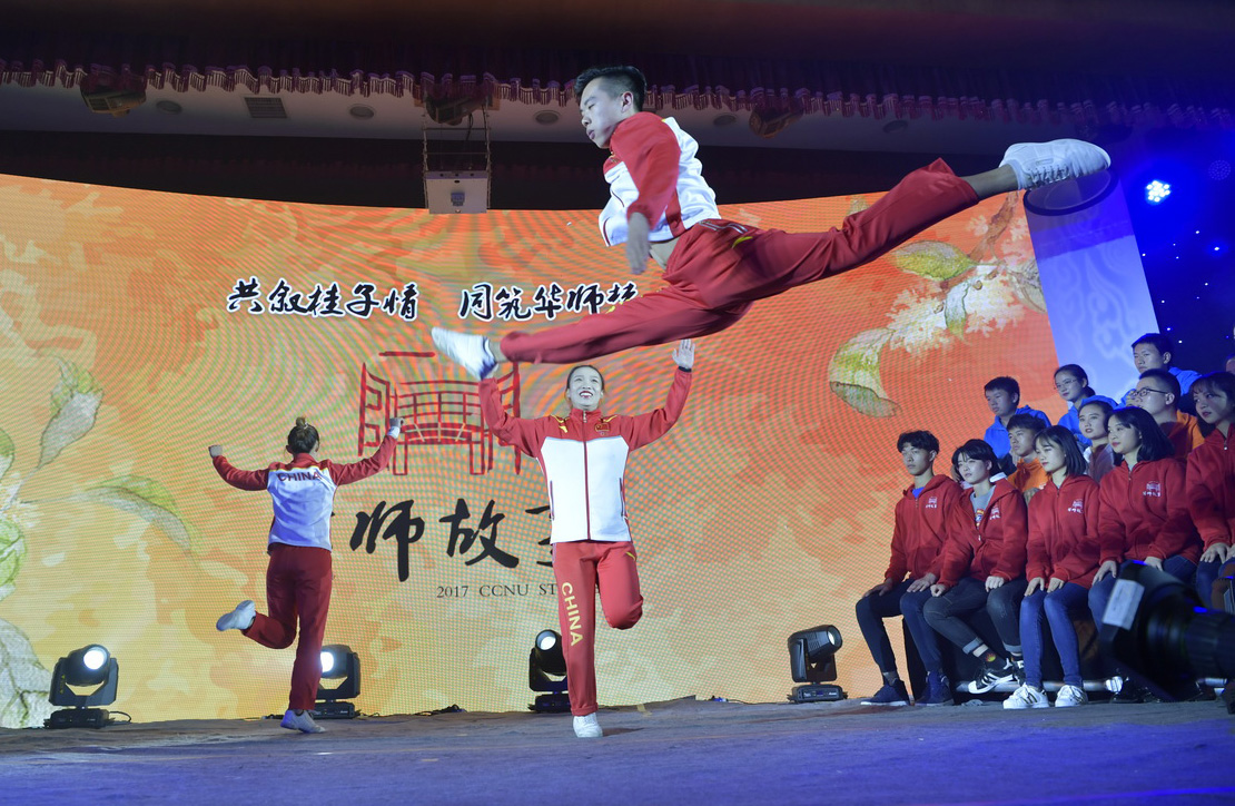 2006年世界健美操锦标赛男单冠军、六人操冠军华师人;2007年世界杯总决赛男单、六人操冠军华师人;2007年世界杯赛男单、六人操冠军华师人;2008年……2009年……2010年……2017年的冠军华师人;世界冠军大满贯、体育荣誉奖章获得者都有华师人,这就是我们华师的体育教育成果,这就是我们华师的素质教学成果,这就是中国的体育教育、中国的素质教学成果。自华师人进入国际和国家健美操舞台,先后获得了14项次的世界冠军和多个亚军、季军,获得了几十次全国冠、亚、季军,先后为国家健美操队输送了4名运动员,培养了4位世界冠军和30多位全国冠军。