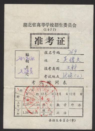 恢复高考第一届:1977年届高考准考证(考生吴绪玖年届30岁)